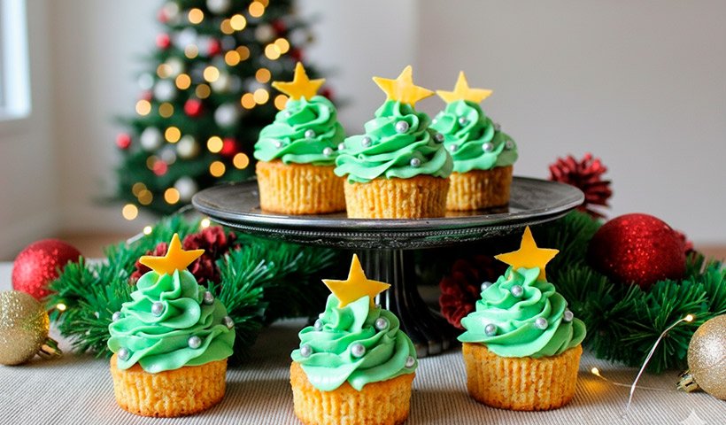 Una vez fríos, decora con buttercream, glaseado blanco, ganache de chocolate o chantilly. Añade frutas confitadas, chispas o bastones pequeños para darles el toque navideño.